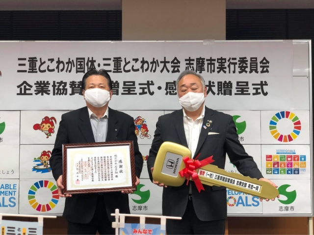 CSR活動等 志摩市とこわかPRカー寄贈! 三重県建設業協会志摩支部に所属する7社の有志で、 来年開催されるとこわか大会のPRにと 志摩市の公用車として使用してもらうため寄贈しました。 PRカー写真感謝状新聞掲載記事感謝状贈呈式