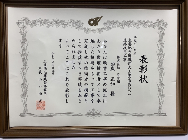 CSR活動等 優良施工事業所表彰2020 令和2年7月3日 平成30年発注の主要地方道磯部大王線(志島志島BP)道路改良工事 の施工について優良施工事業所表彰を三重県志摩建設事務所 山口所長 より頂きました。 優良施工事業所表彰柴原正和工事長受賞