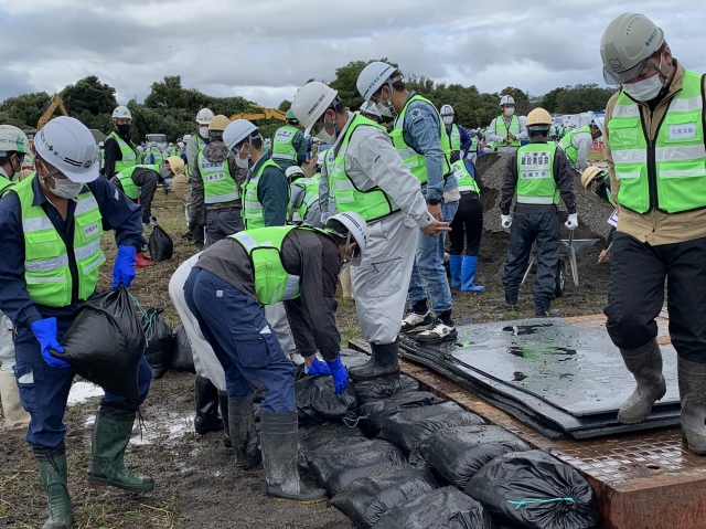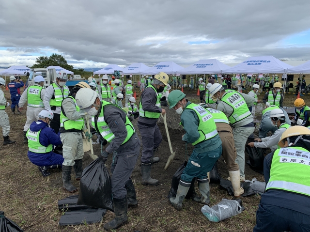 弊社職員も参加し災害時を想定して真剣に取り組みました。地域を護る建設業として
