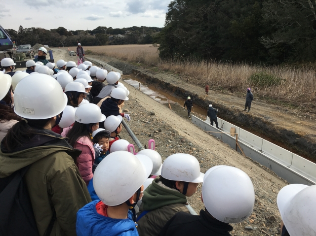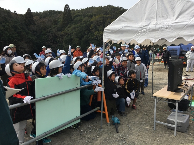 弊社受注の主要地方道磯部大王線(志島バイパス)建設工事の現場見学会が行われました。志摩市立東海小学校3年生51名が道路の出来て行く様子を見学したり建設機械の体験乗車などして学びました。志摩建設事務所と三重県建設業協会志摩支部の共催で行われ将来の建設従事者を期待したい。