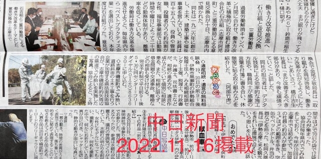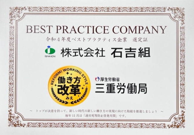 今年3月に三重の働き方改革推進企業として一見知事よりベストプラクティス賞を頂戴致しました。この事を受け三重労働局長 金尾文敬様、三重労働基準部長 片野圭介様をはじめ幹部の方々が弊社にお見えになられ弊社(ベストプラティス企業)との意見交換をして頂きました。金尾労働局長のご挨拶の後、弊社より社長の挨拶に続き弊社総務部長より会社全般の取組、土木工事部中井工事長よりICTの取組等についてご説明させて頂きました。その後、三重労働局様より取組内容につきご質問やご意見を頂戴いたしました。まだまだ課題も山積しております弊社ですが、今後も積極的な取組をして参りたいと思います。