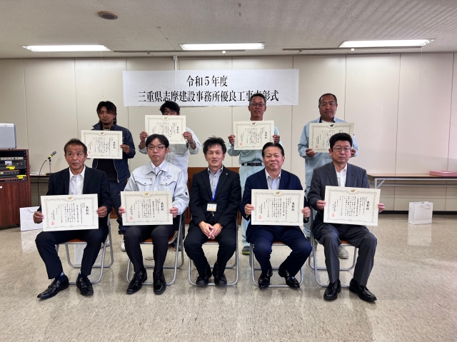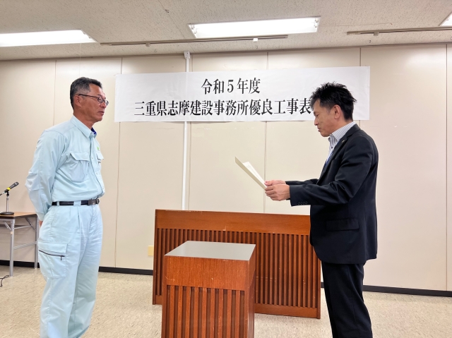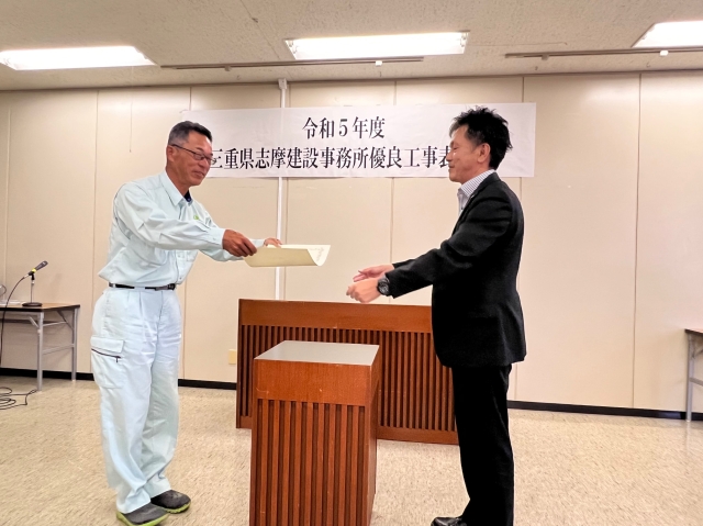令和3年度布施田地区海岸 令和3年海岸災害復旧工事(国災第1号)その一において優良施工事業所並びに優良技術者表彰を三重県志摩建設事務所の野呂守所長より頂きました。誠に有難うございました。今回受賞しました奥谷智充工事長は、これを励みにして若手技術者育成にも力を注いでくれると力強く誓ってくれました。
