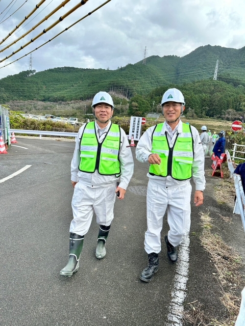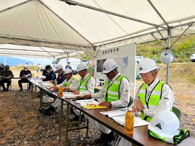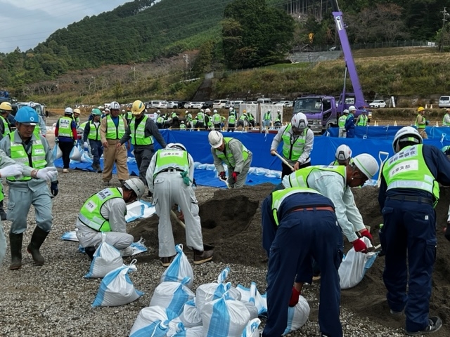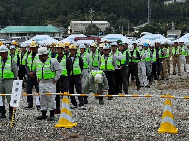 2023.11.9 (一社)三重県建設業協会 第9回災害対応訓練が尾鷲市で開催されました。弊社も参加いたしました。三重県からは、一見知事、若尾県土整備部長、三重県議会議員その他各建設事務所幹部の方々、警察が参加されました。その他には、中部地方整備局幹部の方々、尾鷲市長他、消防、自衛隊などが参加ご協力を頂きました。実際の災害対応を想定して約600名の会員が参加して様々な訓練がなされました。この訓練を通して有事の際には尊い人命と地域を護る為に全力を尽くします。