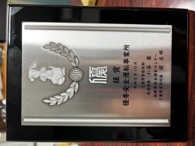 CSR活動等 2023優秀安全運転事業所銀賞 2023.10.31 三重県警察本部交通部長 小谷寛部長様、自動車安全運転センター三重県事務所長 堀主邦様より優秀安全運転事業所として銀賞を頂きました。 金賞目指して頑張って参ります。 表彰状銀賞盾