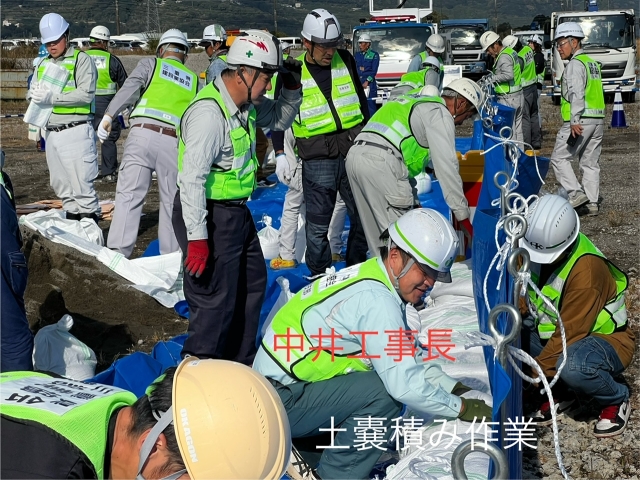尾鷲市で(一社)三重県建設業協会の災害対応訓練が約600名の会員を集め開催されました。一見知事をはじめ若尾県土整備部長他多数の三重県幹部の方々、県議会議員、中部地方整備局の幹部の皆様、熊野市長、尾鷲市長、自衛隊、警察の方々や多くの協力者の下、想定した幾つもの災害対応訓練ができました。志摩支部は土嚢作成並びに土嚢積み作業と瓦礫撤去作業を担当しました。実際の災害では想定外の事も沢山起きるとは思いますが、我々業界は人命や地域を護る為、全力で作業をして参ります。弊社からは社長の橋爪と中井工事長が参加させて頂きました。