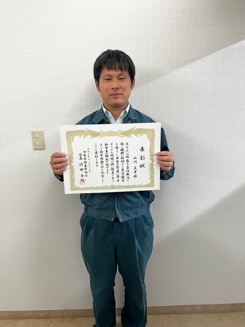 伊勢労働基準協会と建設業労働災害防止協会志摩分会主催による伊勢地方産業安全衛生大会が開催されました。当日、弊社建築部の山川晃平主任が優良勤労者表彰を伊勢労働基準協会、浜田吉司会長から頂戴いたしました。山川主任のこれまでの労働に感謝致します。また、これを励みに山川主任の今後のご活躍を期待いたします。
