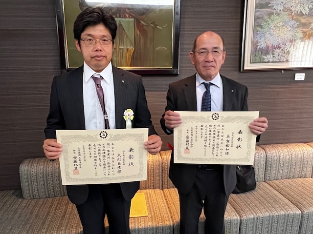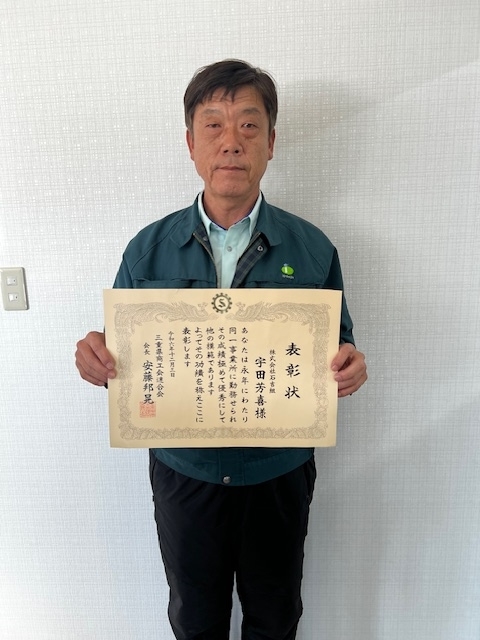 CSR活動等 2024.12.3 三重県商工会連合会優良従業員表彰 2024.12.3 三重県商工会連合会の功労者表彰式が行われました。弊社は、平賀部長と大形次長、宇田次長が三重県商工会連合会会長表彰で「優良従業員表彰」を安藤会長から賜りました。当日は、従業員表彰者を代表して平賀部長が登壇致しました。3人には、これまで社業発展の為にご尽力頂いてきた事に感謝申し上げます。引き続き模範となり後輩たちを導いて頂きます様宜しくお願い致します。 優良従業員表彰状授与式優良従業員代表平賀部長と大形次長宇田次長
