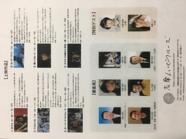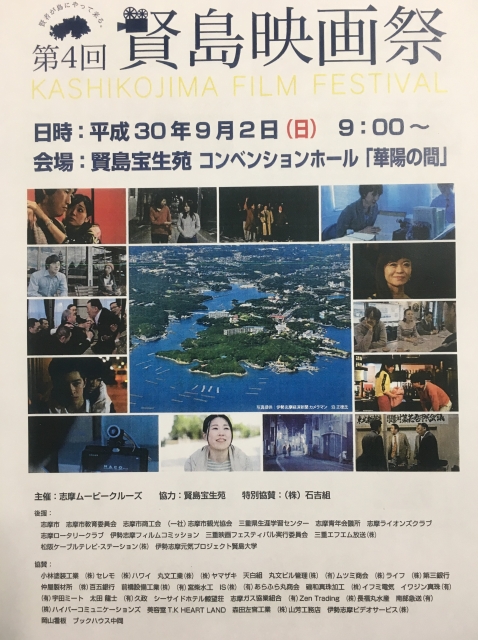 第4回賢島映画祭(メインスポンサー) 平成30年9月2日賢島宝生苑にて「第4回賢島映画祭」が開催されました。 今年は、東京をぶた舞台にした映画「オーバーナイトウォーク」がグランプリを 受賞されました。※詳しくは志摩ムービークルーズ公式HPをご覧ください。 第4回賢島映画祭ポスター第4回賢島映画祭ポスター