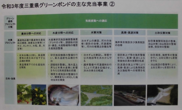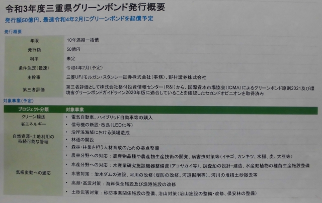 三重県グリーンボンドへの投資 グリーンボンドは、企業や地方公共団体等が、環境改善効果のある事業や環境保全のための事業等(いわゆるグリーンプロジェクト)に要する資金を調達するために発行する債券です。弊社、三重県のこの取組に賛同し投資をする事に致しました。 三重県グリーンボンドの発行概要三重県グリーンボンドの主な充当事業三重県グリーンボンドの主な充当事業